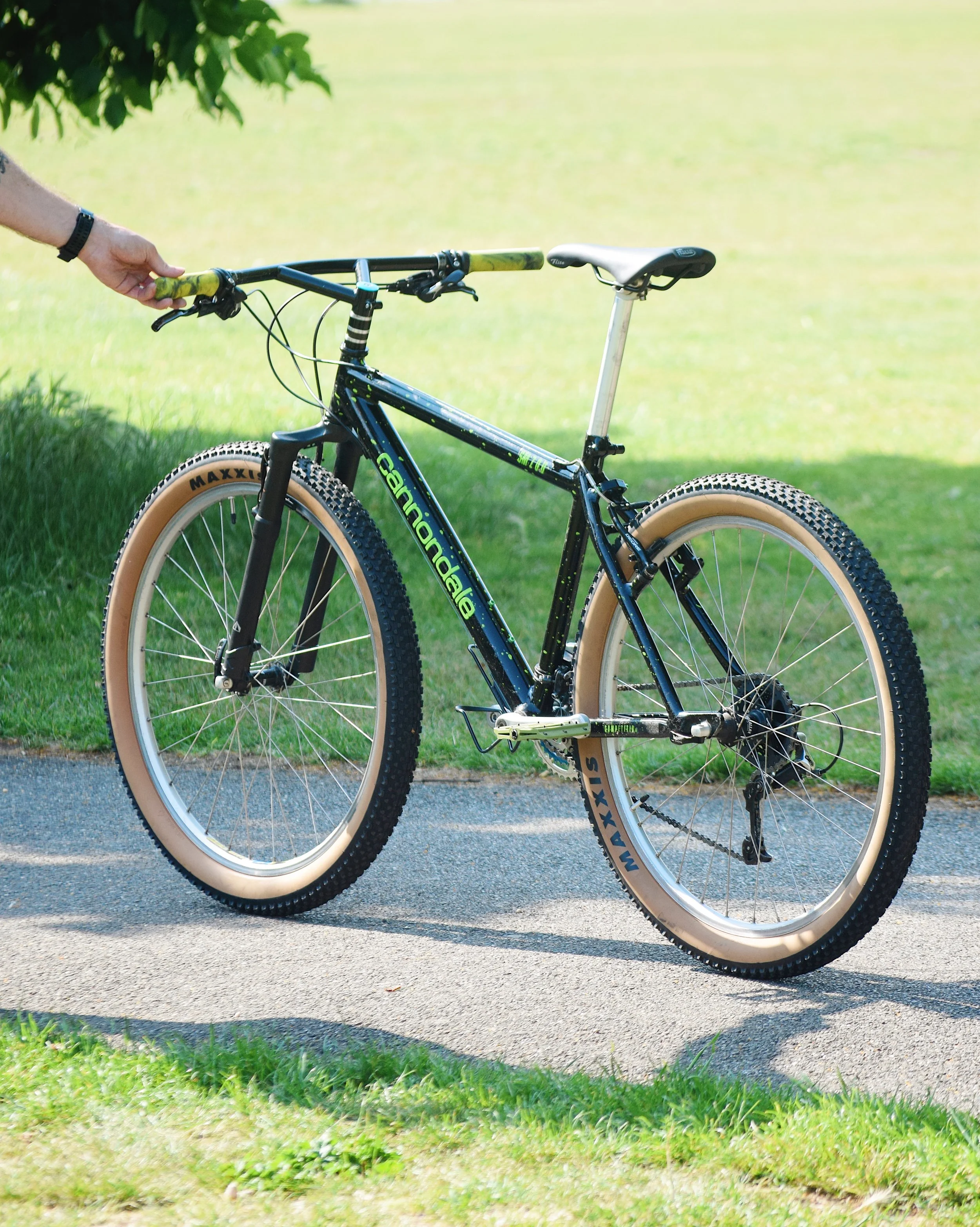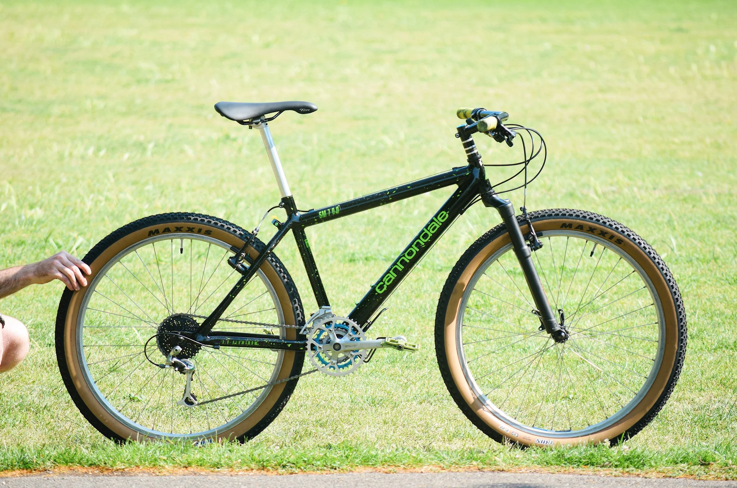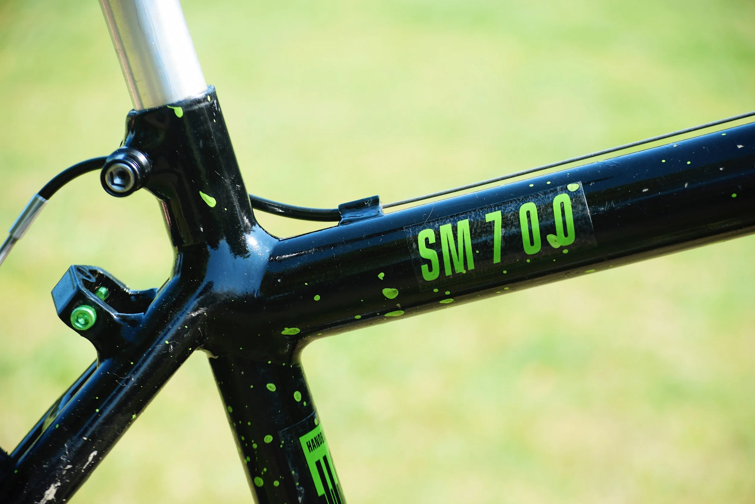 Introducing a completely re-visited mid 90’s Cannondale SM 700 aluminium mountain bike, in black and speckled green. Heaps of panache everywhere with Shimano XT 8x3 groupset, Nitto bullmouse bars, Middleburn chainrings and an Exotic rigid alu fork.